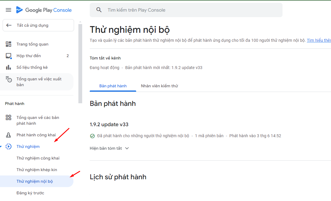 Menu: Thử nghiệm > Thử nghiệm nội bộ > Tạo bản phát hành mới